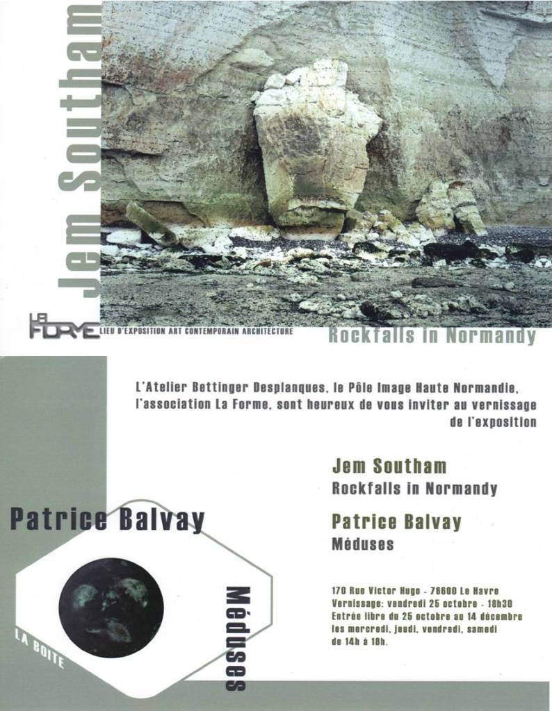 C’est en 2004 que le photographe anglais Jem Southam entame la série Rockfalls in Normandy grâce au programme de résidence de création sur le thème du territoire initié par le Pôle Image Haute-Normandie. Né en 1950 à Bristol, Jem Southam vit à Exeter et enseigne la photographie à l’université de Plymouth. Depuis 1981 il a mené conjointement six importantes séries sur le paysage dont une sur les falaises, d’abord en Angleterre puis sur le littoral du pays de Caux (Bénouville, Sotteville-sur-mer, Petites Dalles, Saint-Pierre-en-Port…). L’ensemble présenté à La Forme réunissait essentiellement des très grands formats que permet l’usage d’une chambre photographique 20 x25. Les paysages de falaises que présente Jem Southam ne sont pas figés mais au contraire montrent des murs de roches en mouvement, où les éboulements, les accidents géologiques provoqués par l’érosion des marées mais également les variations de couleurs des strates ainsi que la lumière changeante, sculptent les parois vertigineuses. Véritables architectures de pierre, gagnées par une inexorable ruine, les falaises géantes de Jem Southam propose paradoxalement une médiation sur la fragilité de la nature.