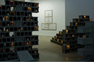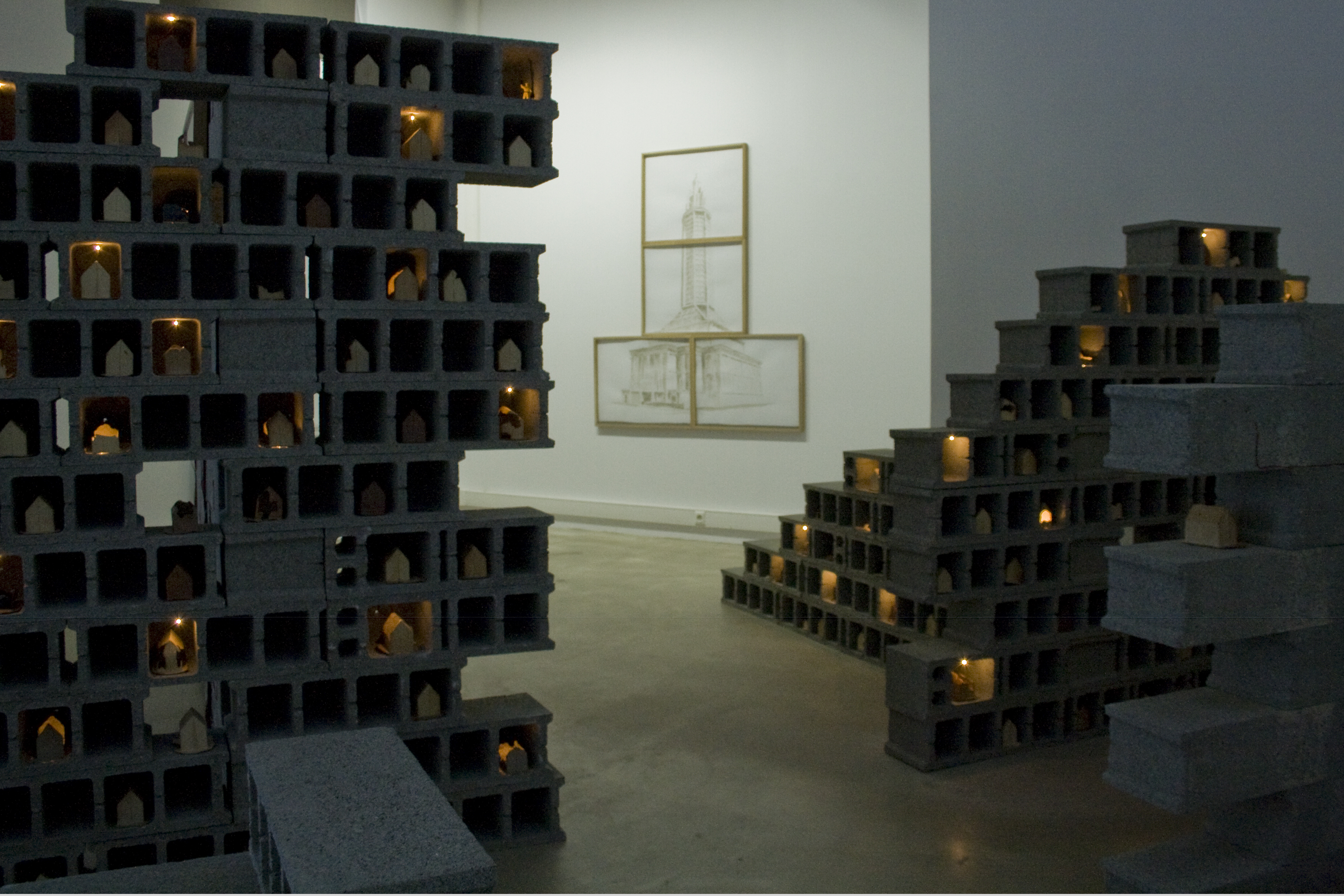 Image précédenteImage suivante Anne Houel, Les pondeuses, vue de l’installation à La Forme, 2014 copyright Anne Houel Anne Houel, Pondeuses, parpaings, céramiques, dispositif électrique et am- poules, dimensions variables, 2012-2014