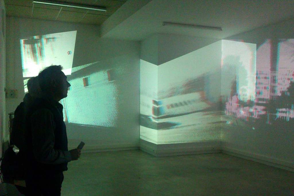 Le premier espace est entièrement recouvert de plusieurs séries d’images fixes extraites des séquences filmées. Les cinq cent images de 37,5 x 28 cm sont collées directement sur le mur, bord à bord comme un papier peint. Le second espace accueille un ensemble de vidéoprojecteurs disposés pour créer une multiprojection qui couvrira l’essentiel des murs.