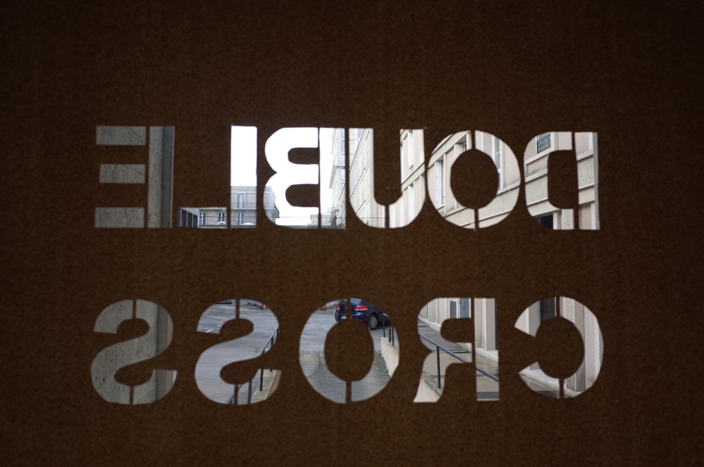 Pour prolonger son exploration des différentes formes d’art contemporain qui interrogent l’architecture moderne et particulièrement celle du Havre, La Forme invite le cinéaste Christophe Guérin à créer une proposition spécifique pour le lieu. La matière première de cette installation, Double Cross, vient des images tournées pour mon film Cross (2014, 4’50). Filmé en Super 8 noir et blanc, Cross est un parcours à travers le centre reconstruit du Havre, soumis à une double condensation. Temporelle : le trajet dans la ville, filmé en discontinu est restitué par un flux d’images précipité. On ne flâne pas, la visite se fait au pas de course, au risque de la chute. Spatiale : Les parcours se chevauchent, se croisent ; les points de vues se multiplient, l’horizon fait défaut, les lignes s’entrecoupent. L’espace ordonné du tissu urbain est totalement brouillé.