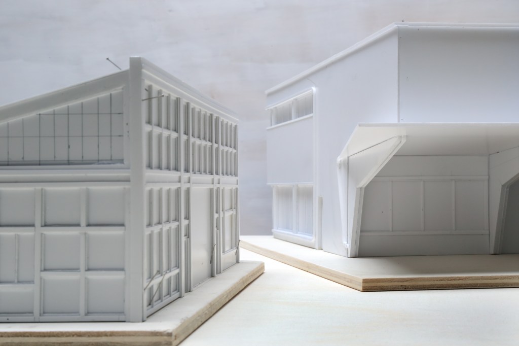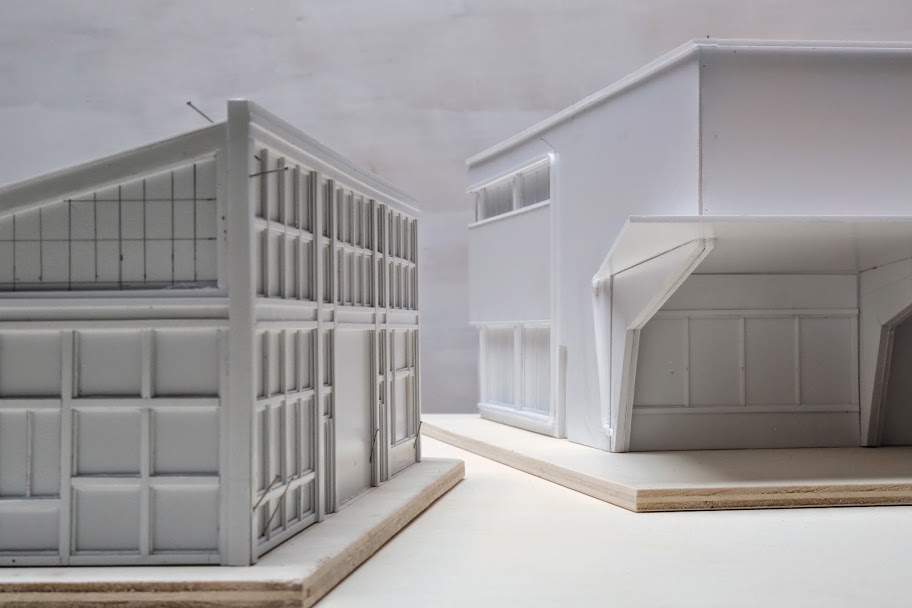 Invité par La Forme dans le cadre du mois de l’architecture contemporaine en Normandie, l’artiste Edouard Sautai réalise un work in progress qui l’amène à occuper le lieu par une maquette-sculpture surdimensionnée, conçue à partir du souvenir de deux garages, construits au Havre après-guerre mais détruits depuis. Il répond à la règle de l’artiste invité en associant le plasticien Jean-François Leroy.