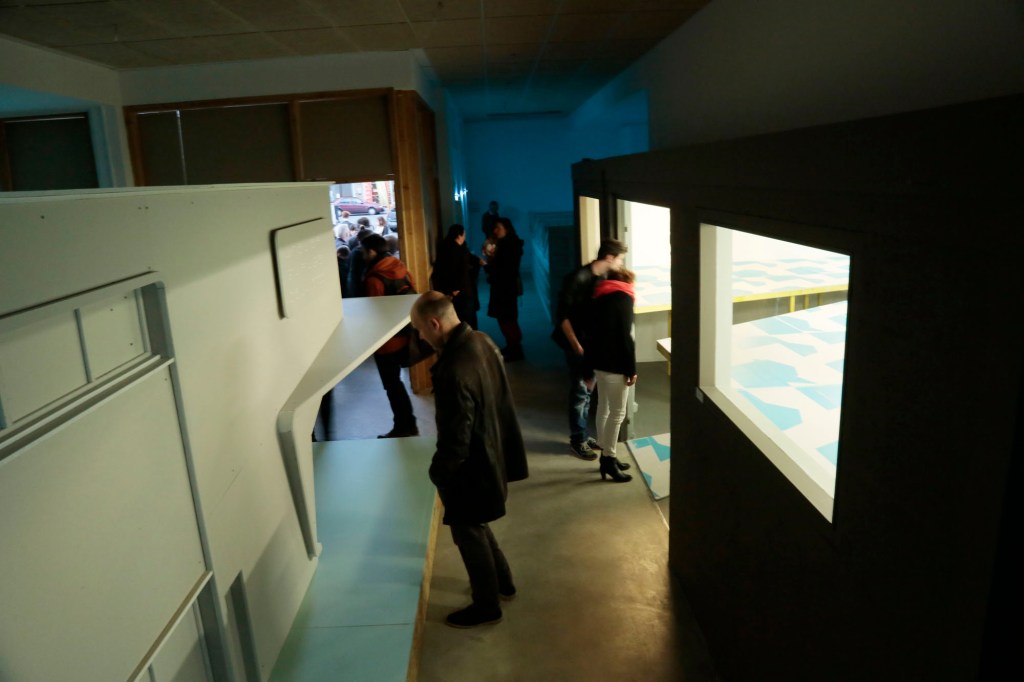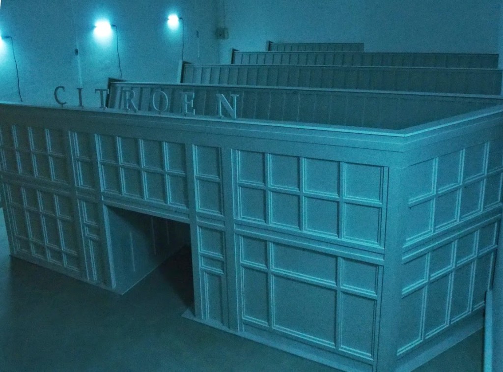 « L’exposition prend place dans le local qui abritait auparavant le cabinet d’architecture Bettinger-Desplanques au Havre. Ce lieu est inscrit dans les architectures de la reconstruction d’après guerre réalisées par l’atelier Perret. L’œuvre qui est proposée ici entre en résonance avec ce contexte particulier pour des raisons historiques et spatiales. Elle est unique et dédiée au cadre, construite sur place, indéplaçable donc temporaire. Bien que de grande dimension, elle reste telle une image fugace, une représentation futile et légère. La maquette qui nous domine est à la fois inachevée et en cours de démolition faisant se rejoindre passé et futur. L’échelle est absurde, inutile sauf pour elle-même. L’architecture dénuée de sa fonction au profit de la forme devient une sculpture. »