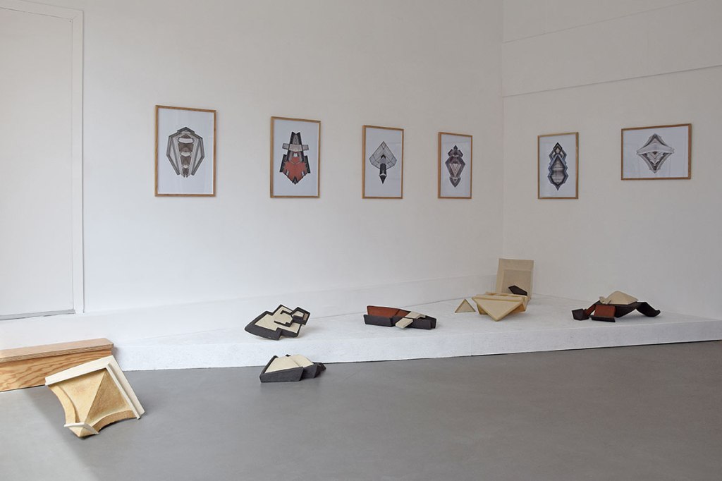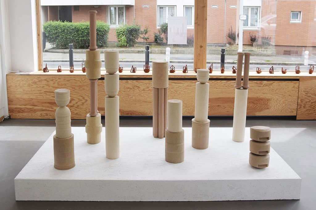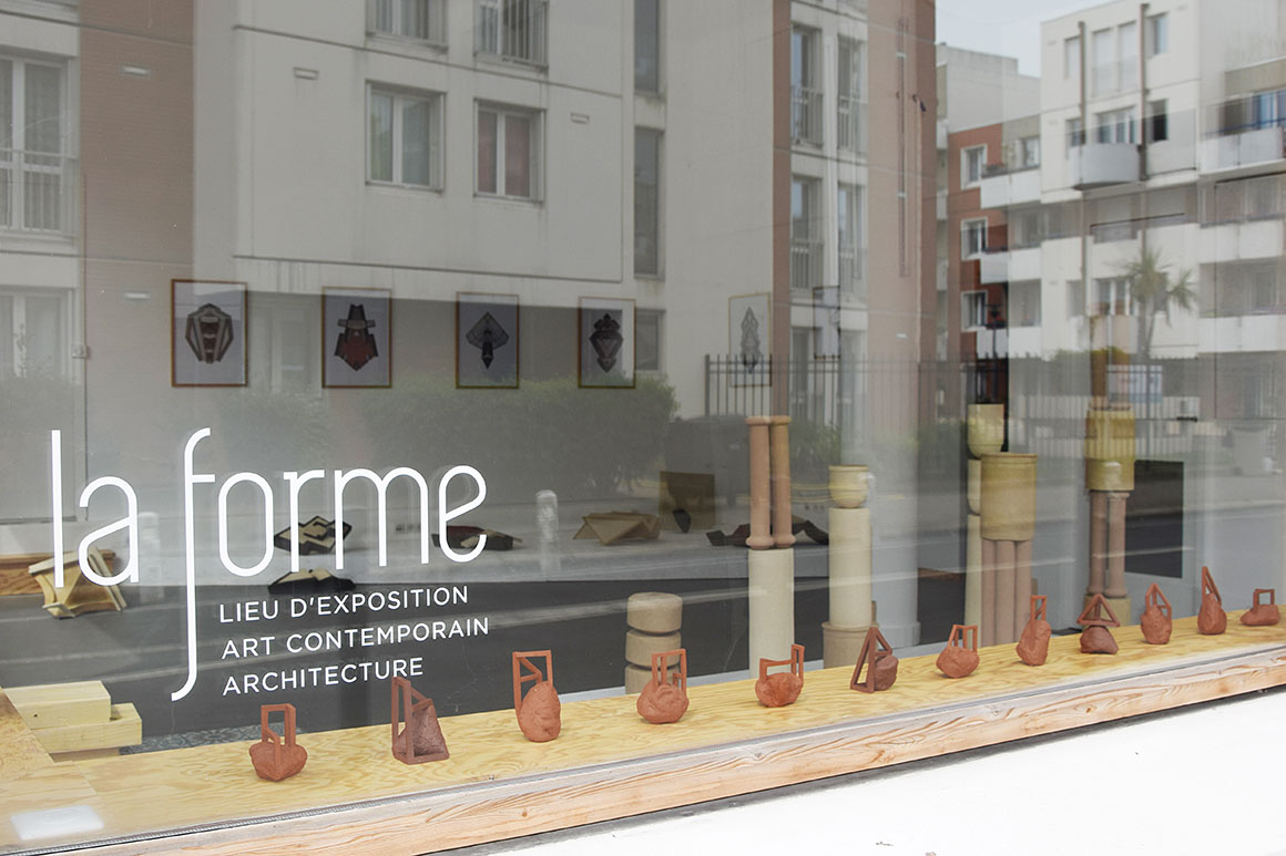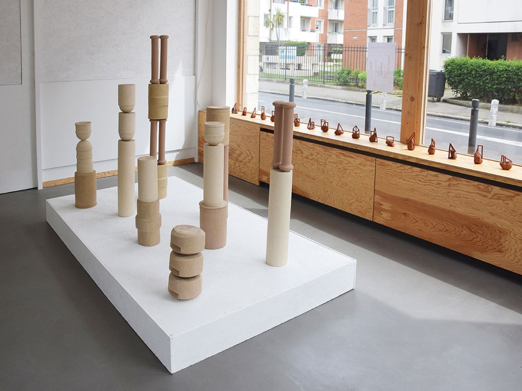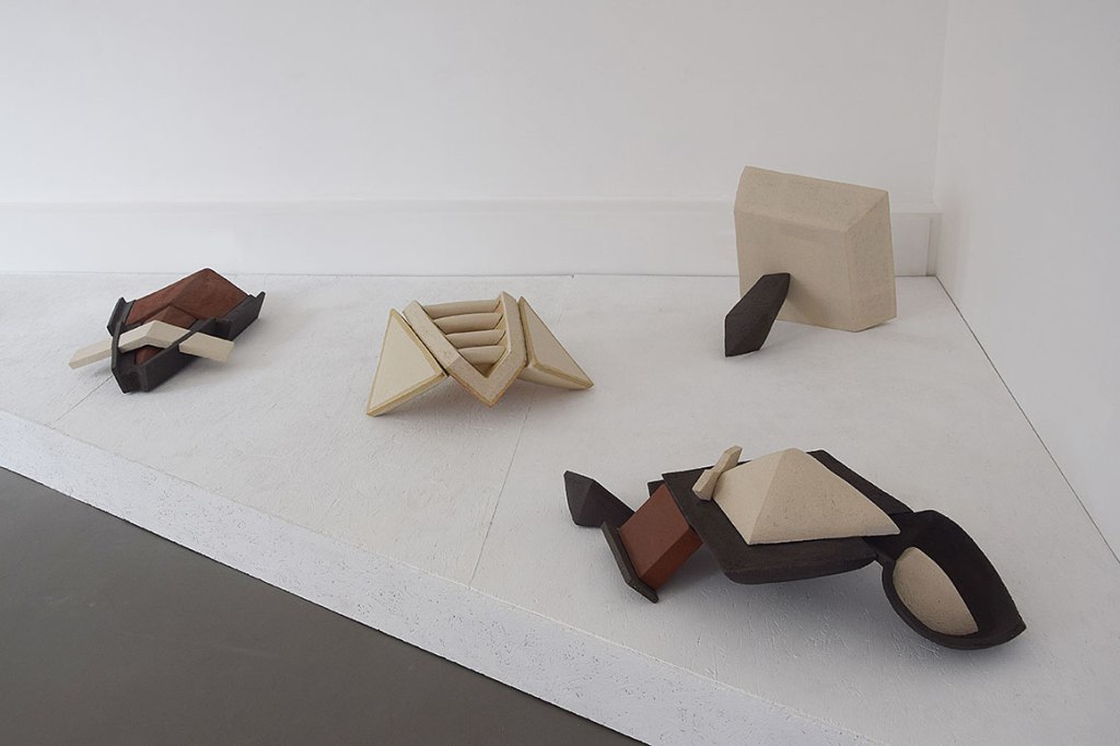Hélène Delépine a choisi le travail de la terre et des procédés de la céramique comme passeur de sa relation plastique au réel architectural. Si l’artiste évoque « un jeu de construction d’images » pour introduire sa pratique, c’est qu’elle s’appuie sur la déambulation dans l’espace urbain afin de collecter les formes qui seront à la base de son processus d’assemblages et de combinaisons. Balises, plaques, plots, corniches, angles, toits… la ville est un vivier de formes abstraites mais réelles que l’artiste fragmente, replie ou déploie à sa guise comme un ensemble de signes, un alphabet à portée de regard et dont il s’agit de révéler le potentiel fictionnel.