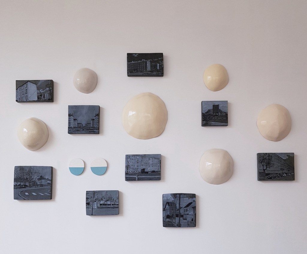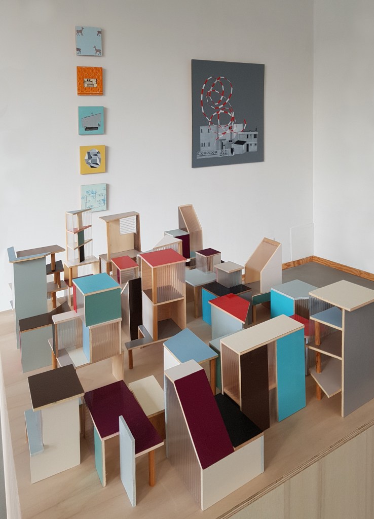 Pour cette exposition, à l’invitation de La Forme, d’un ensemble de ses œuvres récentes, Dominique Dureau a choisi un titre qui exprime combien l’espace construit est au centre de sa démarche d’artiste. L’architecture moderne désormais banale des faubourgs édifiés dans les années 50-60 est son paysage urbain de prédilection mais dans son œuvre il est davantage un acteur qu’un décor. Ce dont témoignent les jeux formels, textuels ou colorés par lesquels l’artiste questionne les vues et les objets qu’il peint, construit ou photographie, avec cette particularité d’un processus en série qui semble vouloir épuiser les possibilités de chaque projet. Il se dégage pourtant de cette démarche plastique très personnelle une grande cohérence que la proposition pensée pour l’espace de La Forme met en évidence en articulant de manière inédite des séries murales et des volumes qui se répondent.