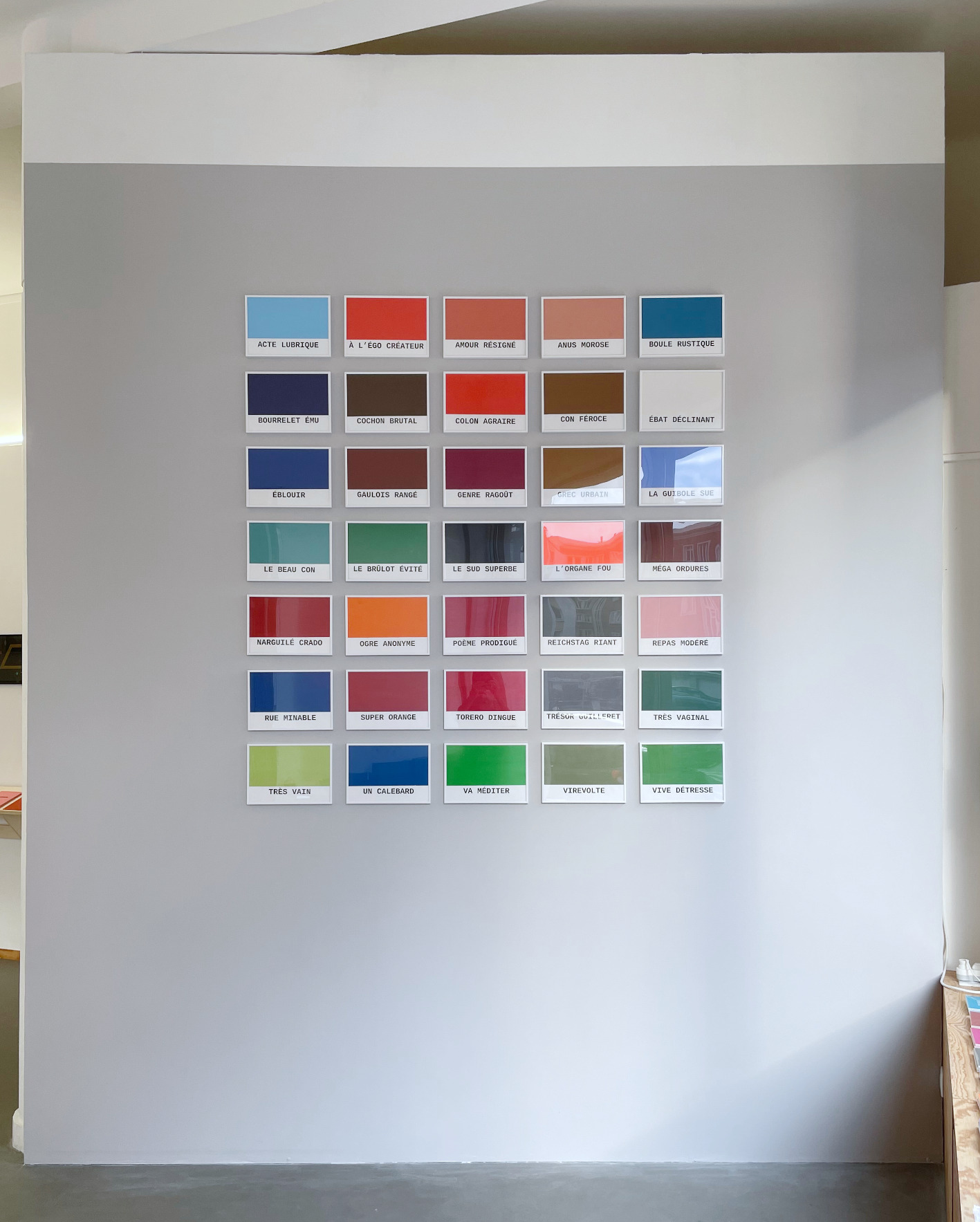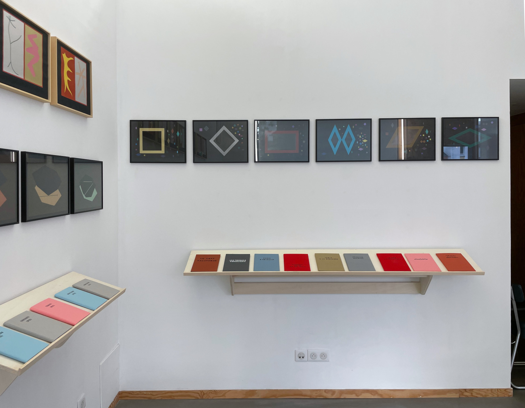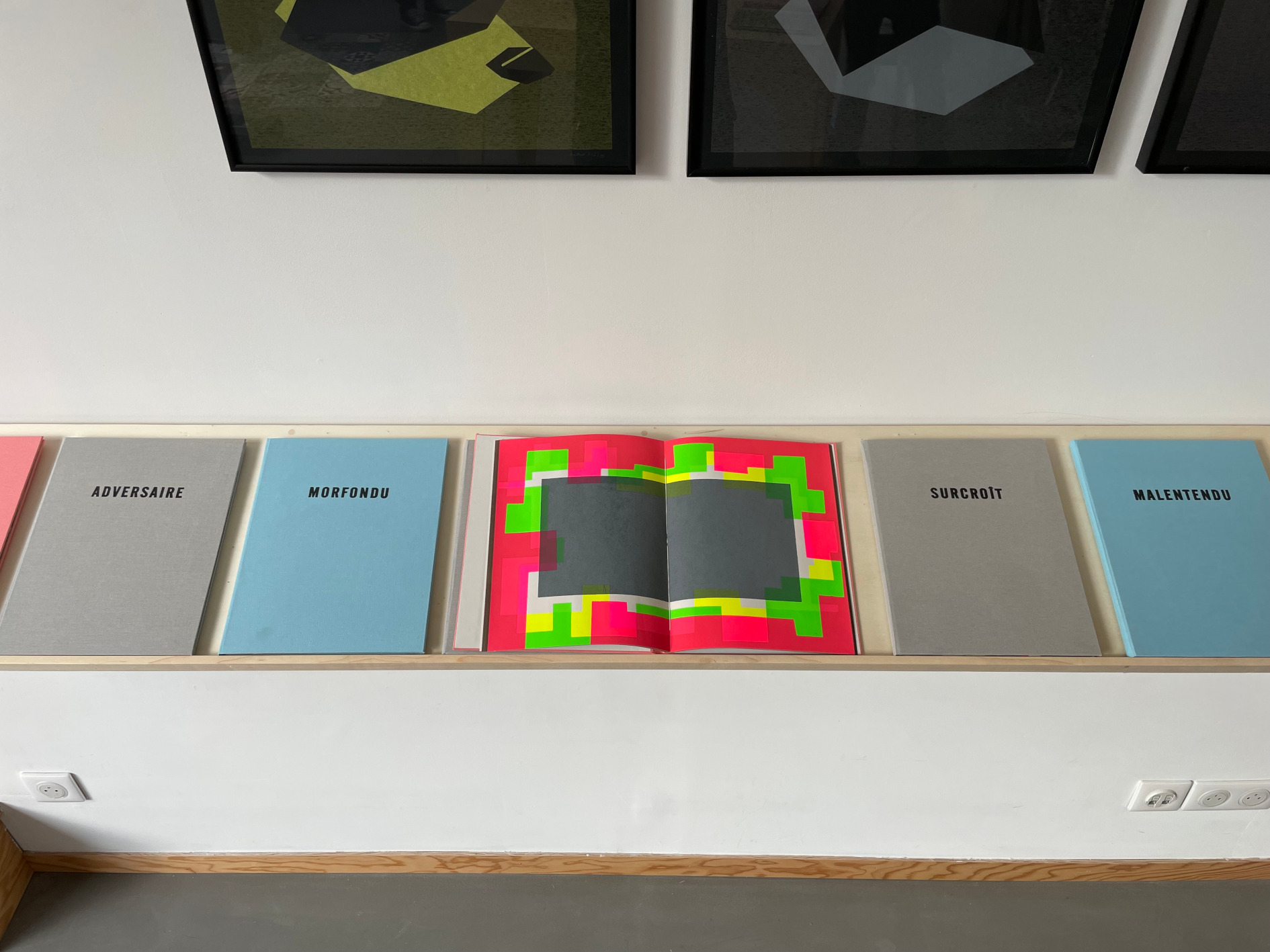L’activité graphique de l’iconomoteur s’exprime depuis quarante ans sous la forme du livre sérigraphié, dont il réalise selon un protocole bien établi, un titre par mois, édité à peu d’ exemplaires. Réunis par thématiques ou séries annuelles, souvent présentés dans un meuble de monstration spécialement créé, les livres de Jean-Claude Mattrat déploient et explorent les ressources graphiques et plastiques des formes et des couleurs dans des jeux de combinaisons infinis. Sans aucun lien narratif mais soudées par une même palette de recherches formelles et colorées, les pages de chaque livre ne parlent que d’elles-mêmes dans un processus d’autoréférenciation assumé. Combinée au soin et à la qualité de leur présentation, c’est à une véritable plongée dans le graphisme comme objet purement plastique qu’invitent ses livres et ses portfolios. C’est d’ailleurs avec ce recul qu’il faut approcher la présence du mot dans l’œuvre de Jean-Claude Mattrat: titres de livres prévus de longue date sans lien avec le contenu ou anagrammes virtuoses sont à aborder, sans exclure une certaine malice, comme des jeux de déconstruction-reconstruction plastiques et poétiques.