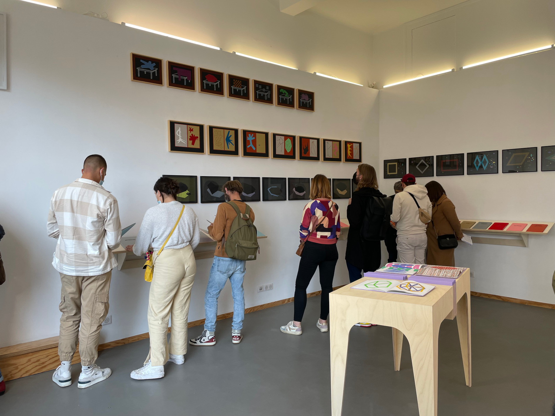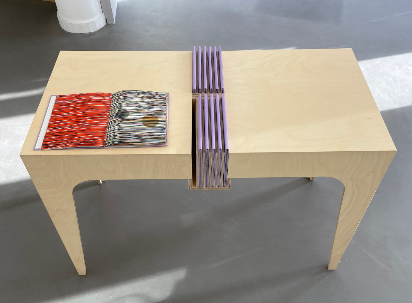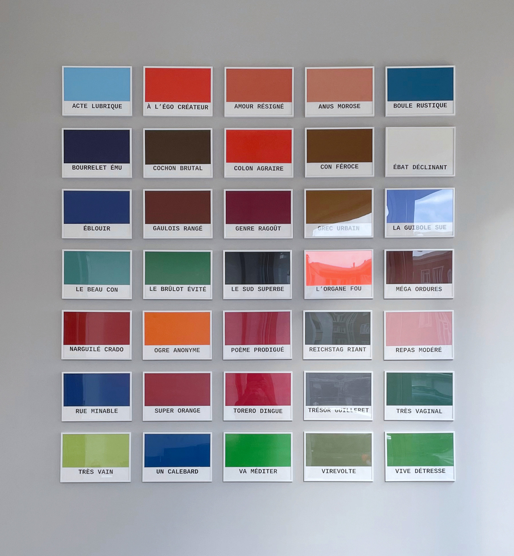 L’activité graphique de l’iconomoteur s’exprime depuis quarante ans sous la forme du livre sérigraphié, dont il réalise selon un protocole bien établi, un titre par mois, édité à peu d’ exemplaires. Réunis par thématiques ou séries annuelles, souvent présentés dans un meuble de monstration spécialement créé, les livres de Jean-Claude Mattrat déploient et explorent les ressources graphiques et plastiques des formes et des couleurs dans des jeux de combinaisons infinis. Sans aucun lien narratif mais soudées par une même palette de recherches formelles et colorées, les pages de chaque livre ne parlent que d’elles-mêmes dans un processus d’autoréférenciation assumé. Combinée au soin et à la qualité de leur présentation, c’est à une véritable plongée dans le graphisme comme objet purement plastique qu’invitent ses livres et ses portfolios. C’est d’ailleurs avec ce recul qu’il faut approcher la présence du mot dans l’œuvre de Jean-Claude Mattrat: titres de livres prévus de longue date sans lien avec le contenu ou anagrammes virtuoses sont à aborder, sans exclure une certaine malice, comme des jeux de déconstruction-reconstruction plastiques et poétiques.