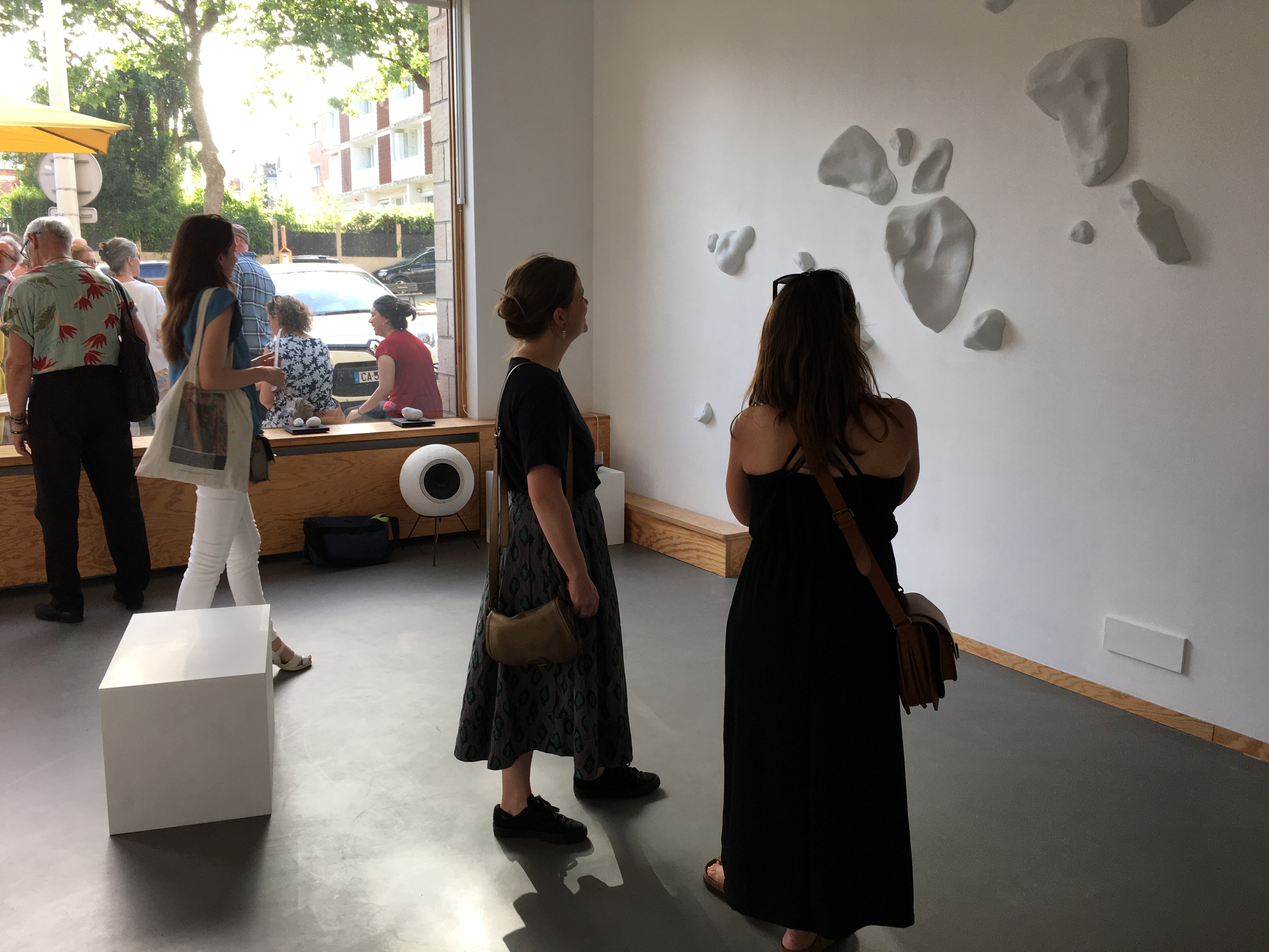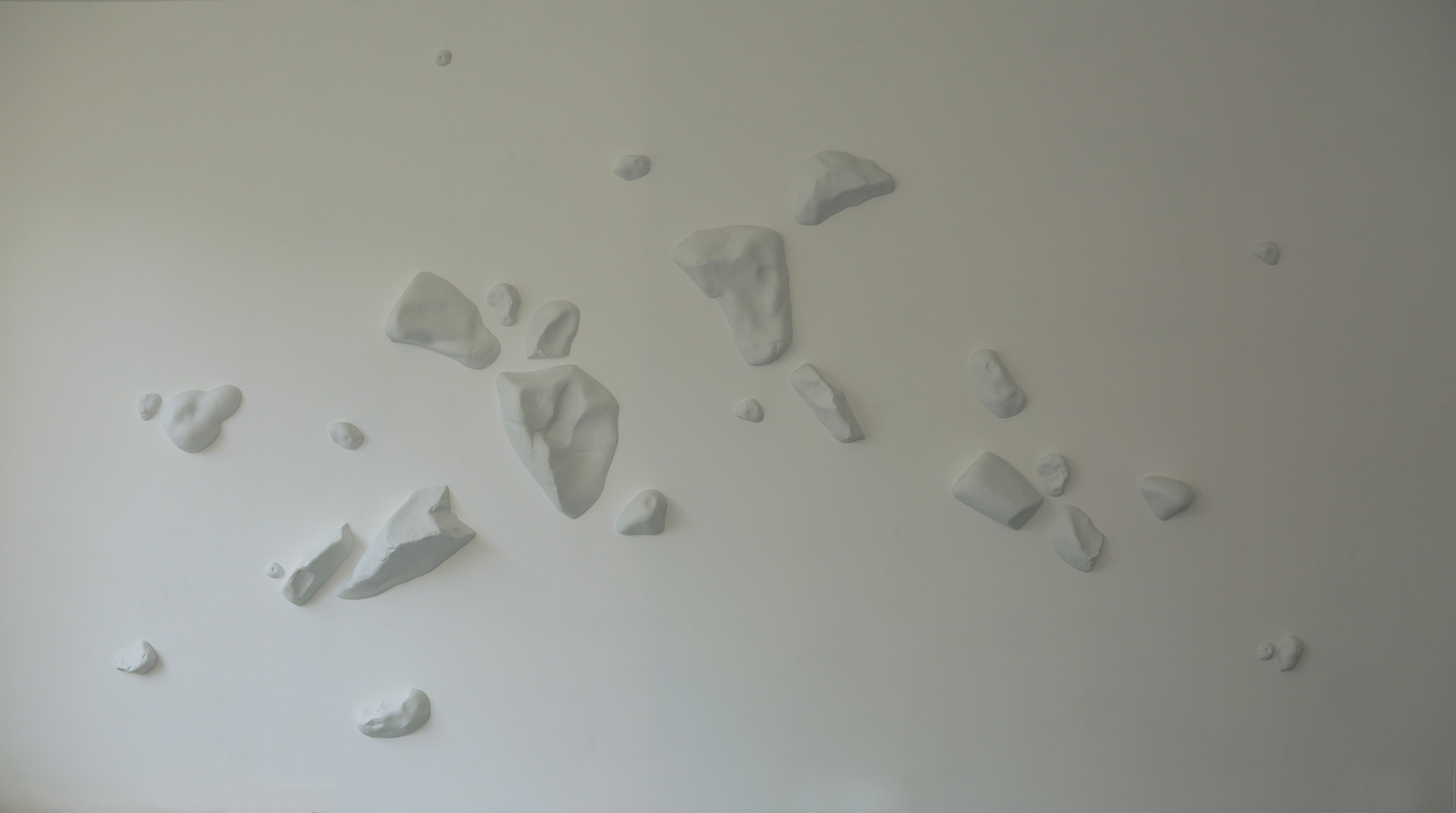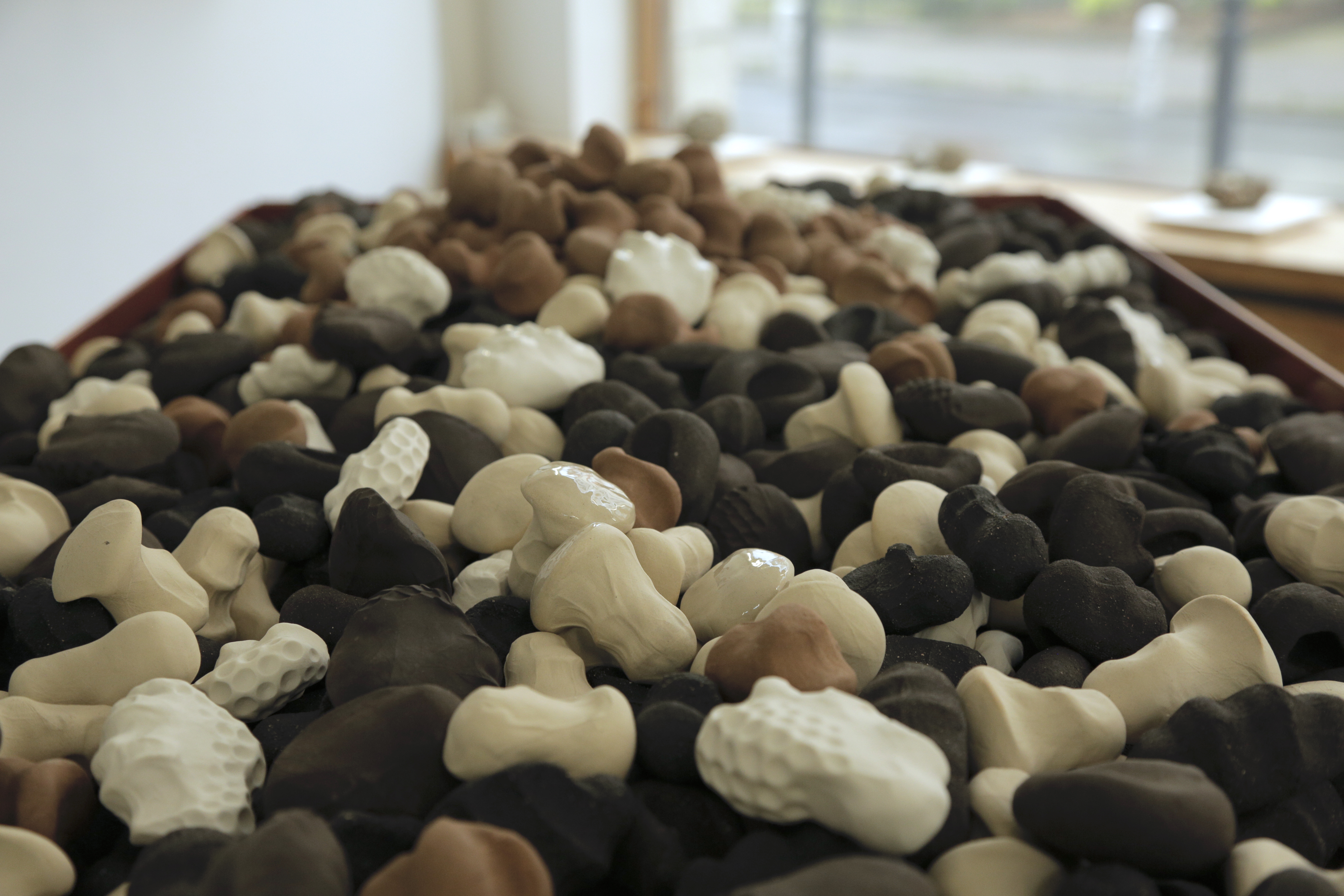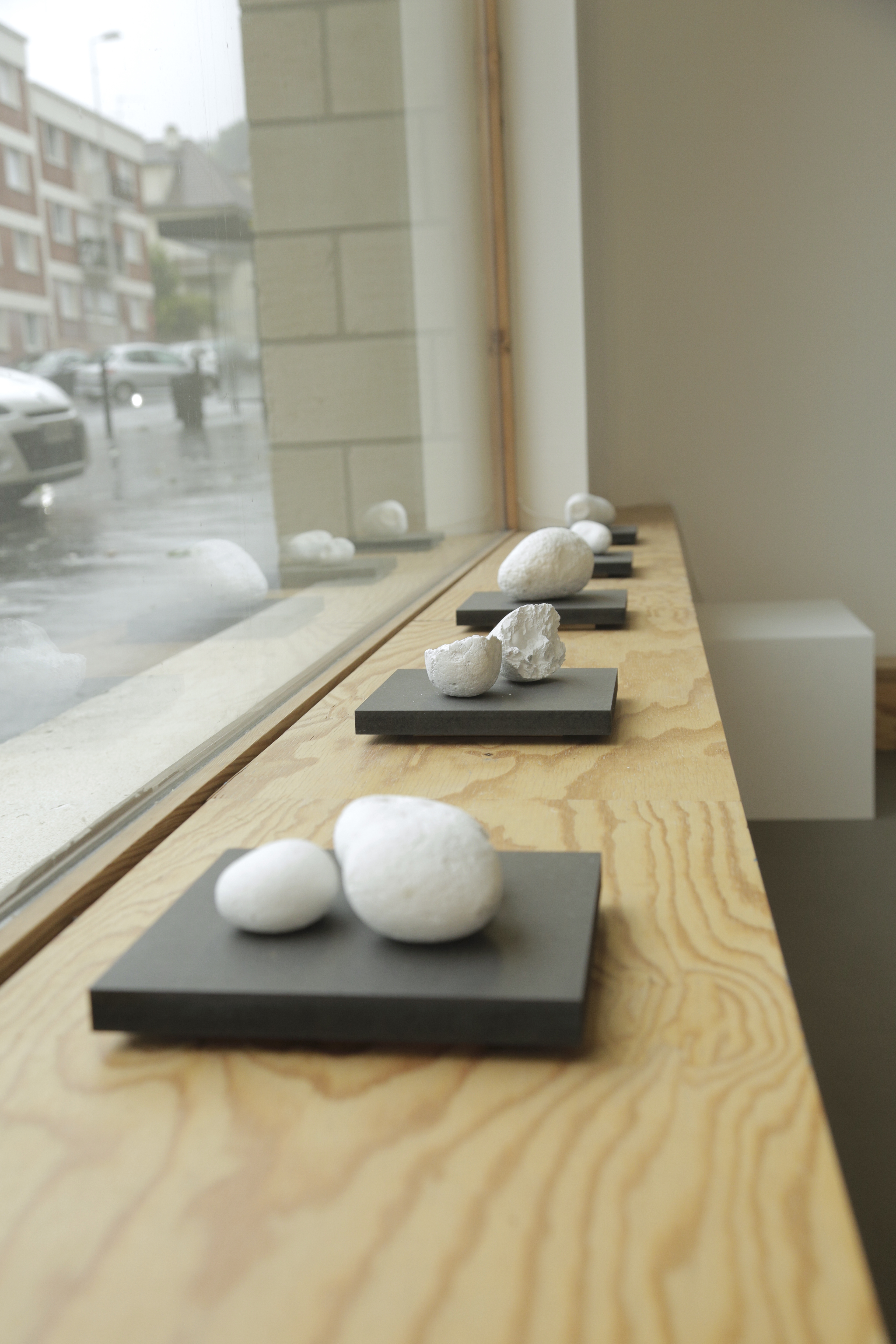 Désormais réalisés en porcelaine, grâce à une résidence au CRAFT de Limoges, une trentaine de rochers de la plage de Vasterival sont présentés pour la première fois dans un dispositif mural qui invite à la contemplation. Ils sont accompagnés de plusieurs pièces qui sont autant de jalons dans ce voyage poétique : photographies du lieu, relevé des emplacements, vidéo des moulages, une création sonore en collaboration avec Eric Thielemans ainsi que d’un livre d’artiste, intitulé Multiples, édité en partenariat avec La Forme. Enfin, le geste étant le fil conducteur de cette étape du projet, geste du moulage comme gestes techniques du céramiste, le geste commun à tous, de saisir et caresser les galets est également réinterprété et amplifié par la création de mille galets en grès, façonnés et cuits par l’artiste qui les propose à la manipulation du spectateur.