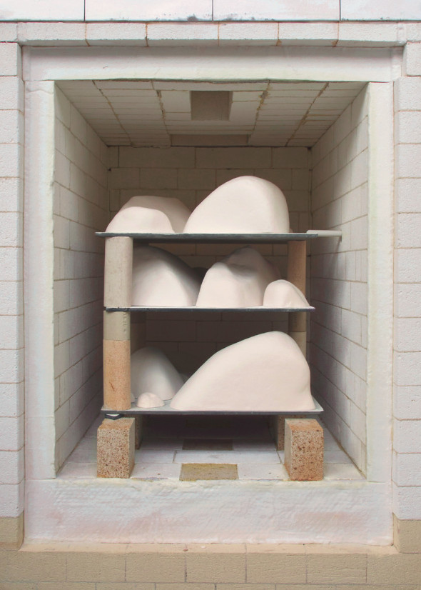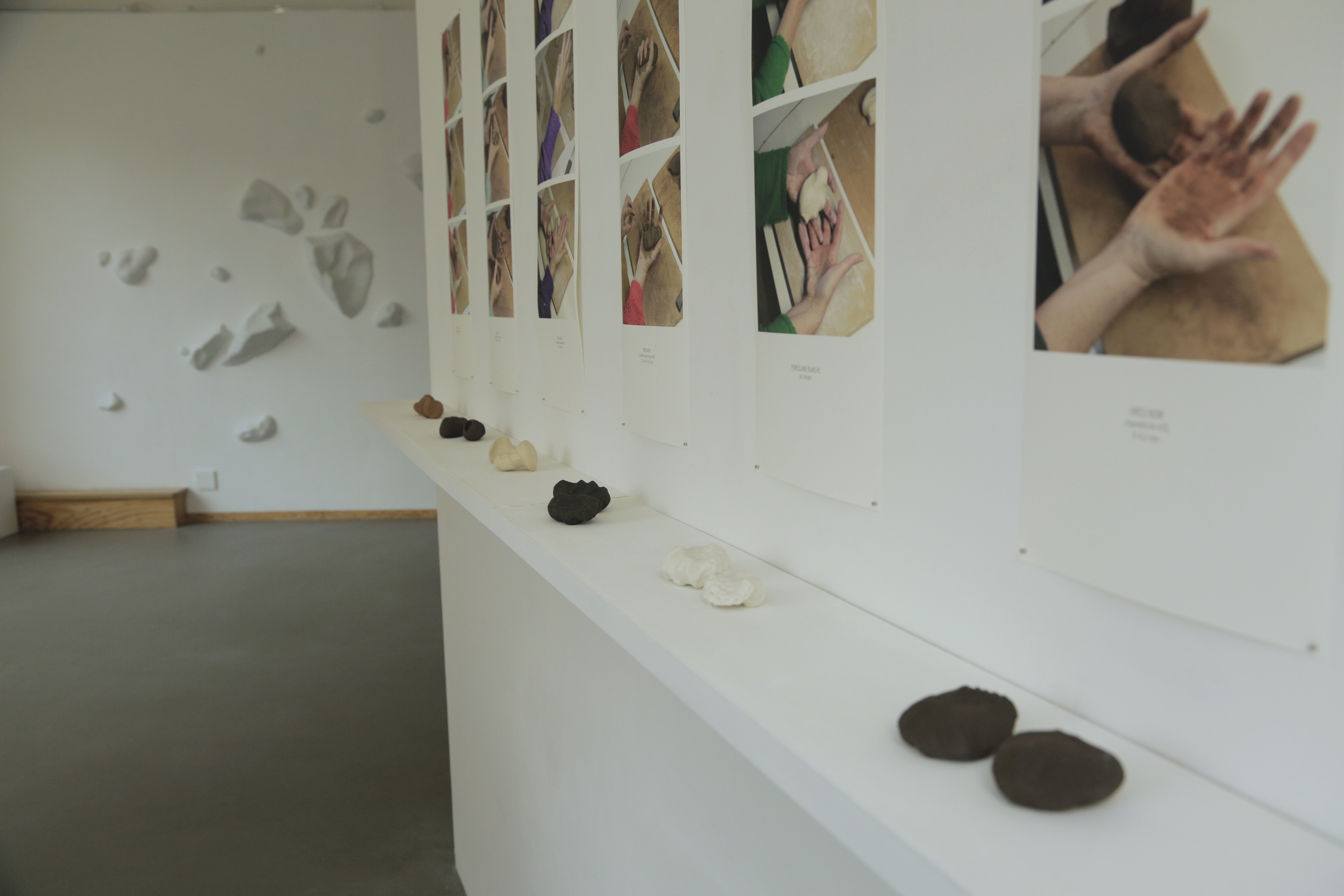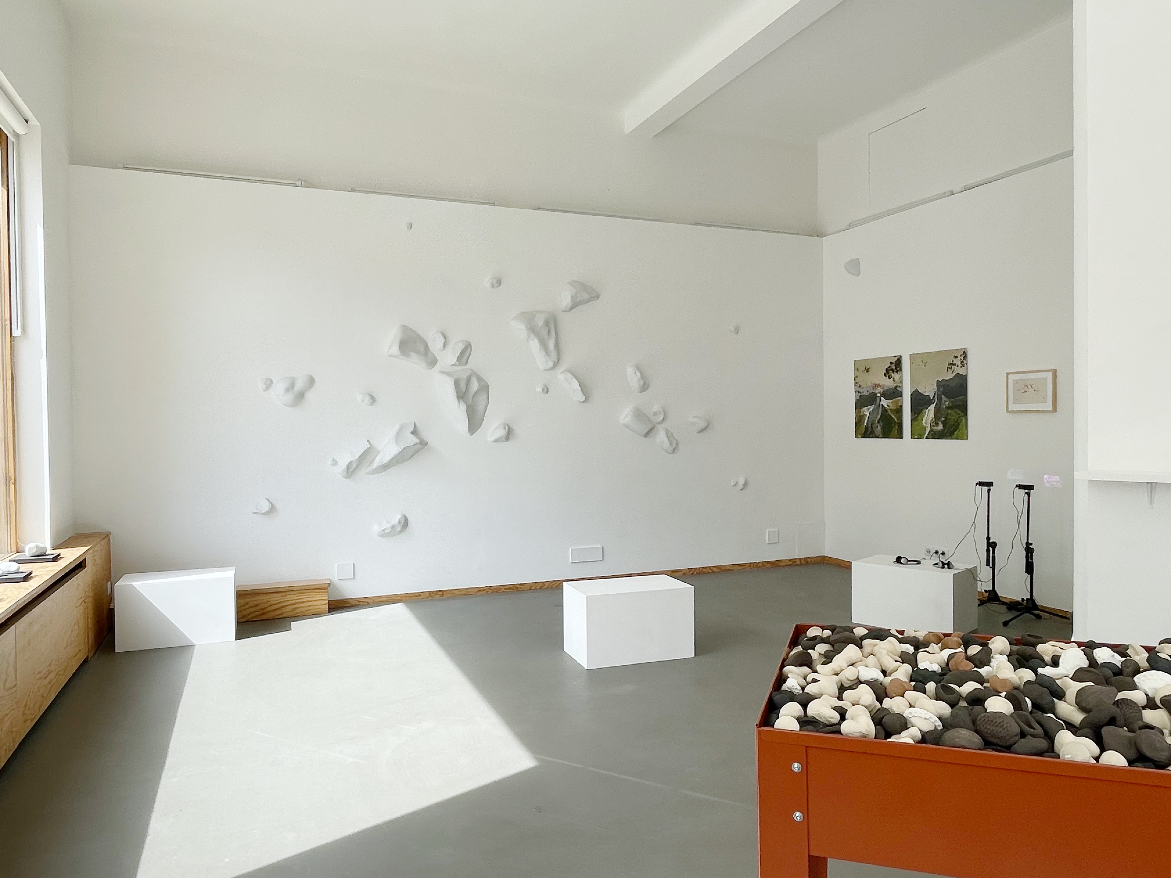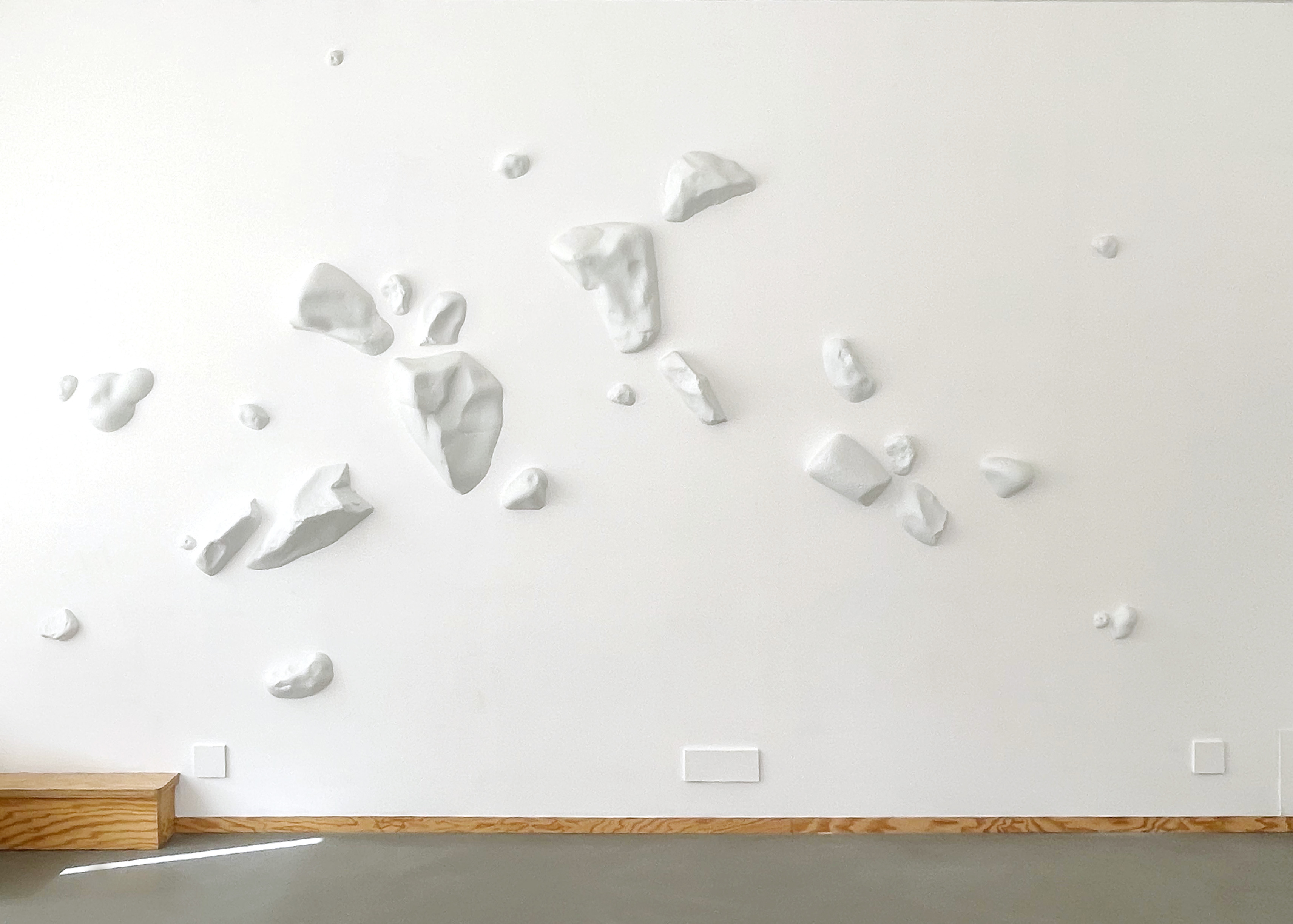Désormais réalisés en porcelaine, grâce à une résidence au CRAFT de Limoges, une trentaine de rochers de la plage de Vasterival sont présentés pour la première fois dans un dispositif mural qui invite à la contemplation. Ils sont accompagnés de plusieurs pièces qui sont autant de jalons dans ce voyage poétique : photographies du lieu, relevé des emplacements, vidéo des moulages, une création sonore en collaboration avec Eric Thielemans ainsi que d’un livre d’artiste, intitulé Multiples, édité en partenariat avec La Forme. Enfin, le geste étant le fil conducteur de cette étape du projet, geste du moulage comme gestes techniques du céramiste, le geste commun à tous, de saisir et caresser les galets est également réinterprété et amplifié par la création de mille galets en grès, façonnés et cuits par l’artiste qui les propose à la manipulation du spectateur.